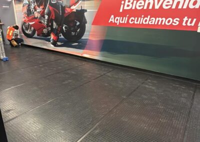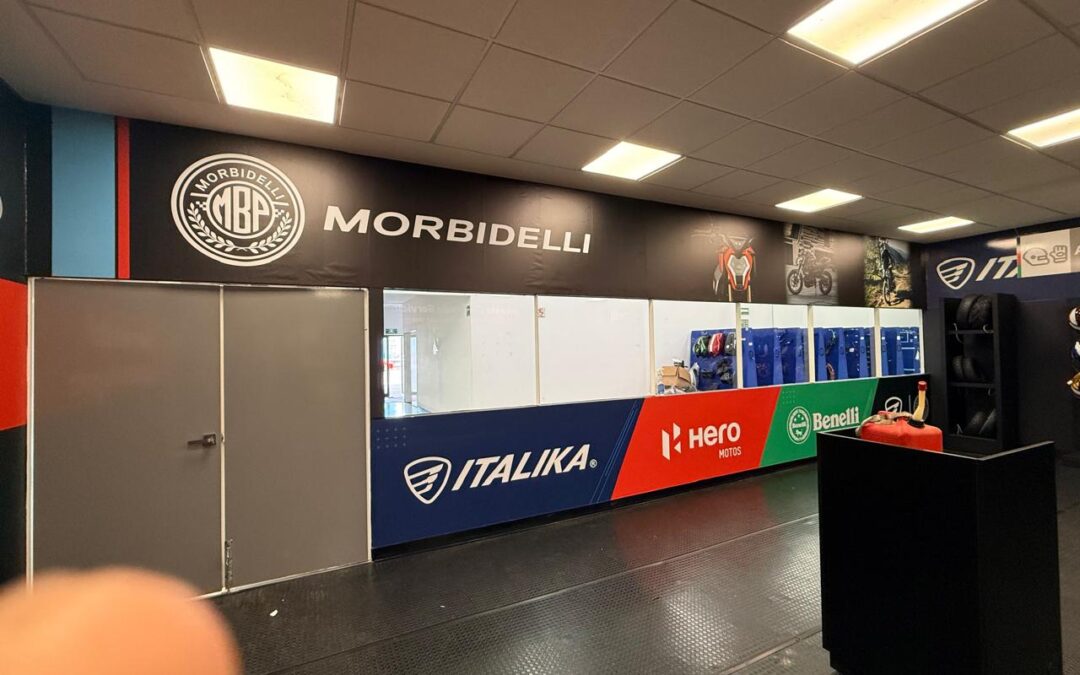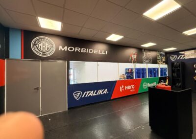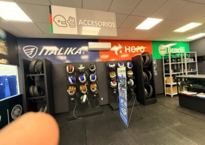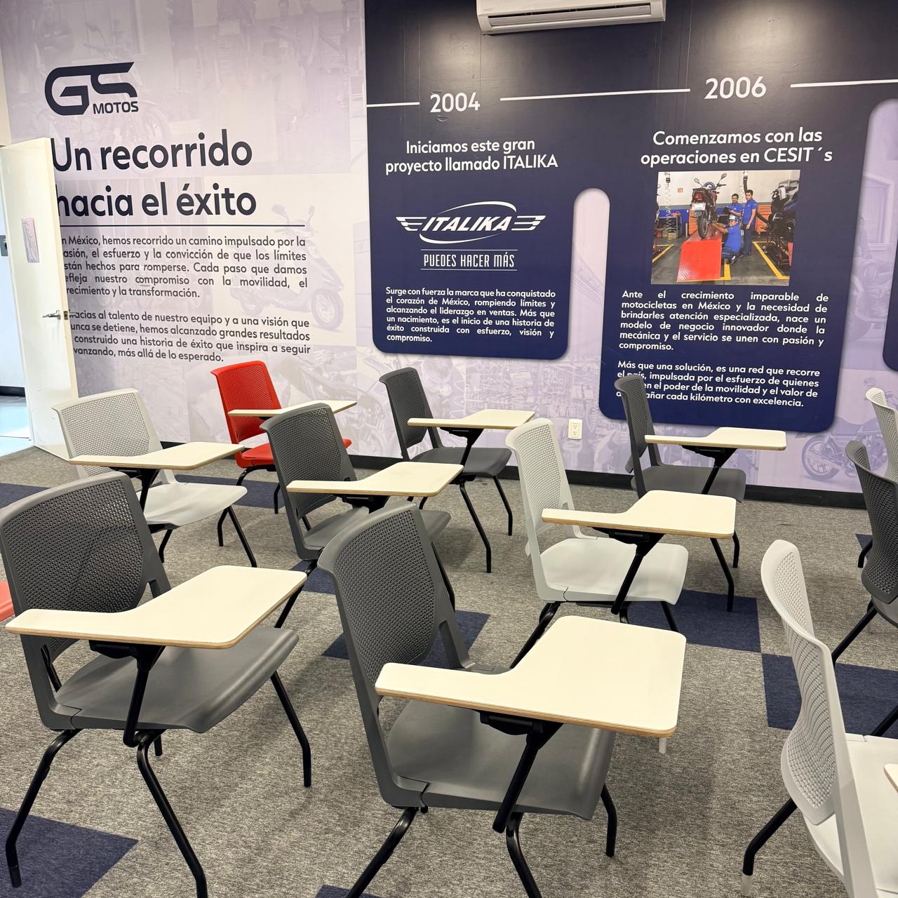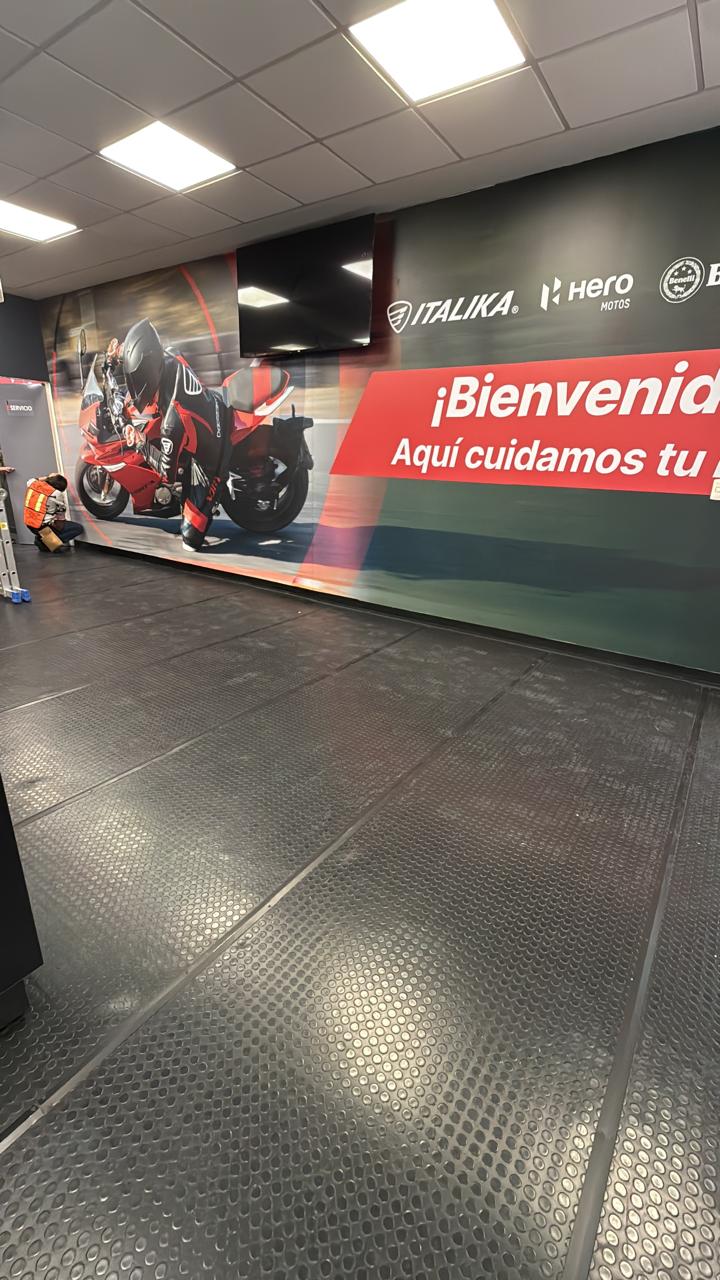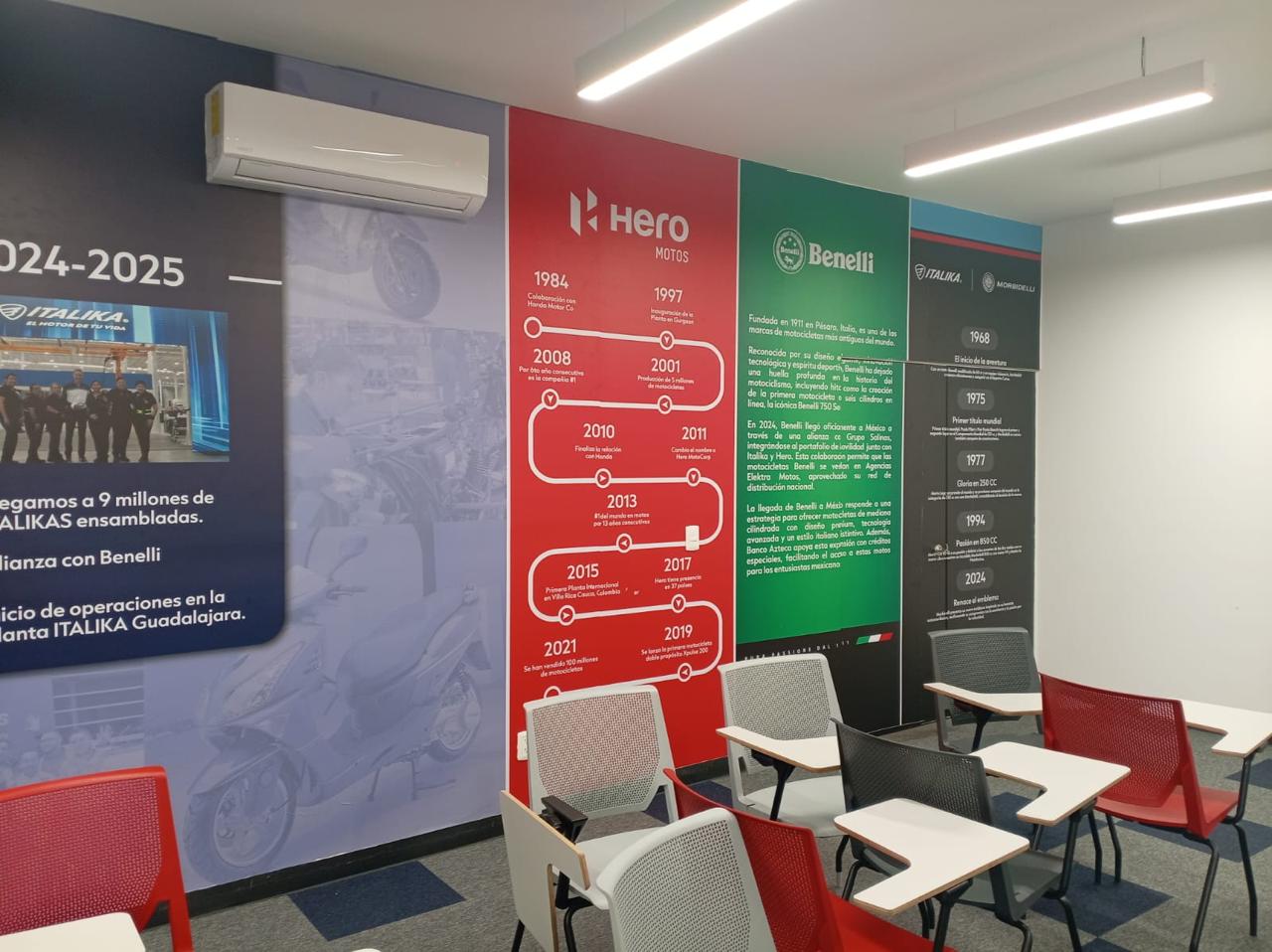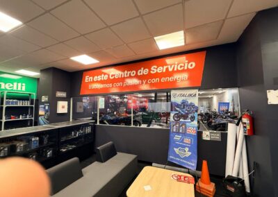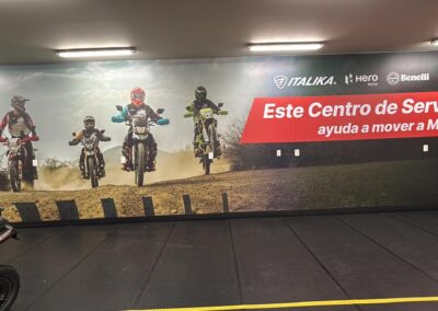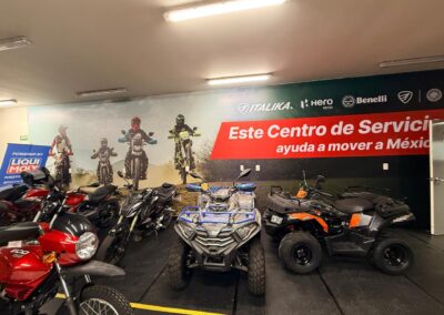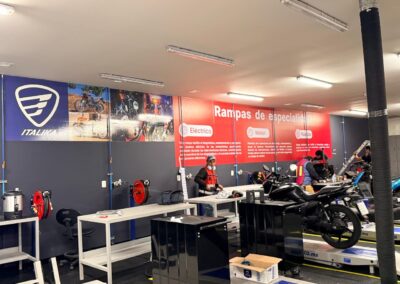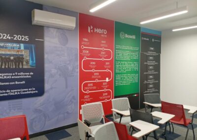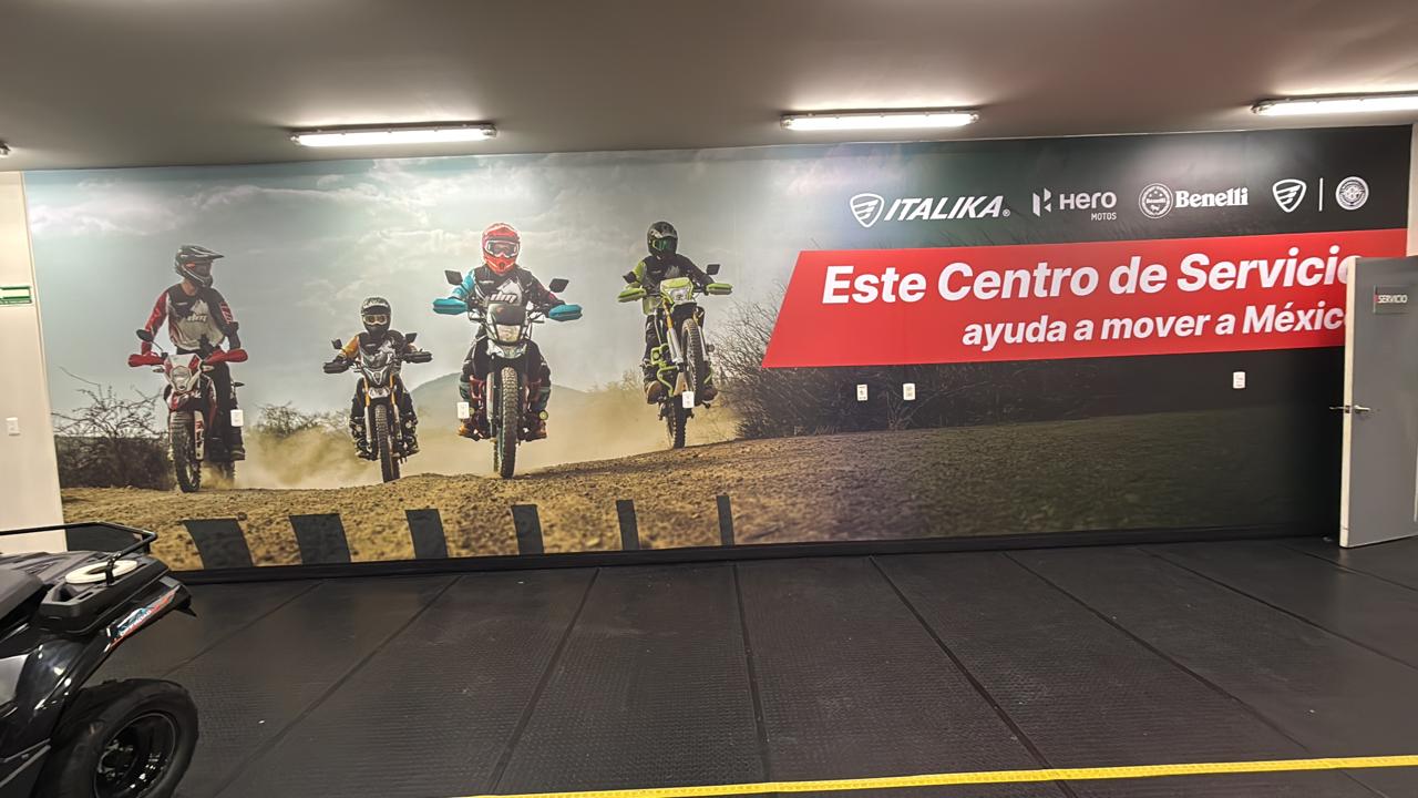 GS Motos, parte de Grupo Salinas, requería transformar completamente su Centro de Servicio y salas de capacitación para reflejar la evolución del negocio y las múltiples marcas que ahora representa: ITALIKA, Hero Motos, Benelli y Morbidelli. El espacio necesitaba comunicar visualmente más de 20 años de historia corporativa, diferenciar las zonas por función (capacitación, exhibición, servicio, accesorios) y crear un ambiente profesional que inspirara tanto a los técnicos en formación como a los clientes. El mayor desafío técnico: las instalaciones presentaban paredes y techos descuadrados con múltiples imperfecciones que complicaban la instalación de gráficos de gran formato donde la continuidad visual era crítica.