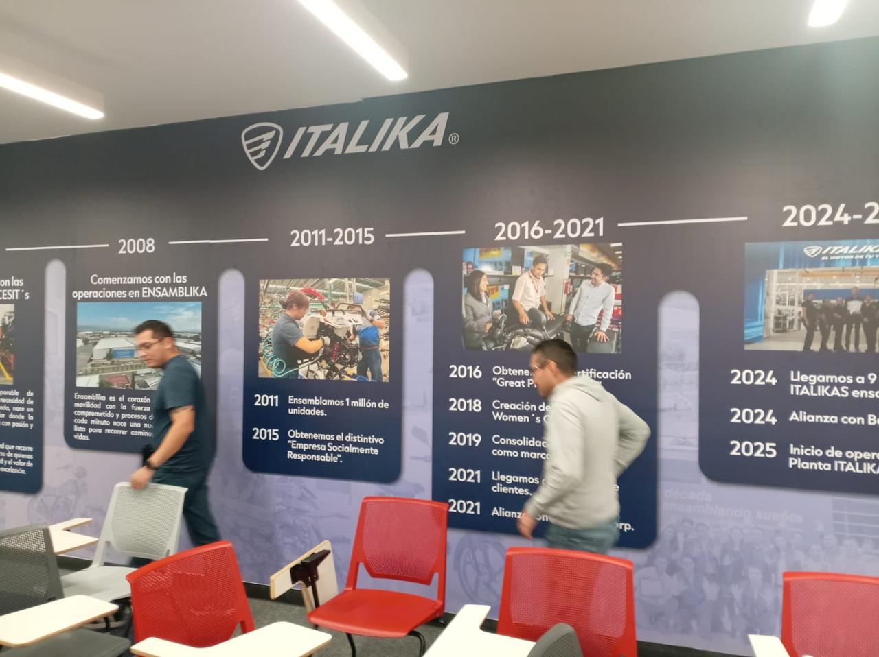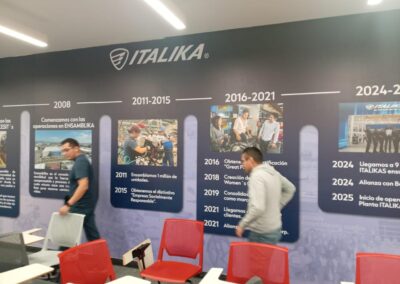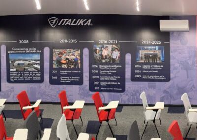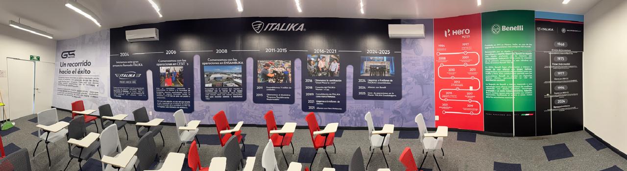 Se desarrolló un sistema integral de comunicación visual que transforma cada área del centro en una experiencia de marca inmersiva. El elemento central es un mural timeline panorámico que narra la historia de ITALIKA desde 2004 hasta 2025, incluyendo hitos como el inicio de operaciones en CESIT's (2006), la planta ENSAMBLIKA (2008), el millón de unidades ensambladas (2011), la certificación Great Place to Work (2016), y las alianzas con Hero y Benelli (2024-2025).