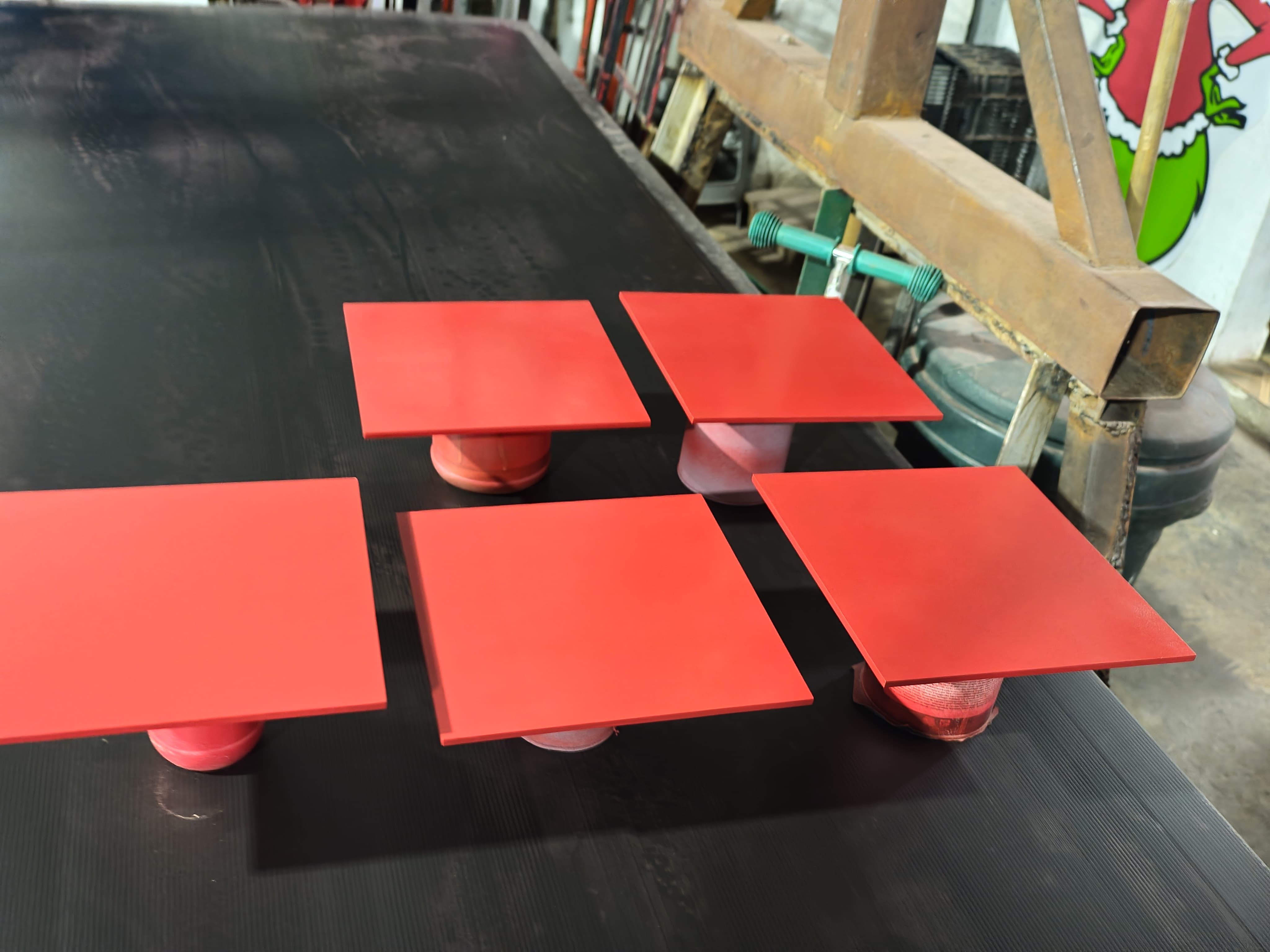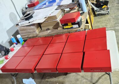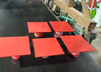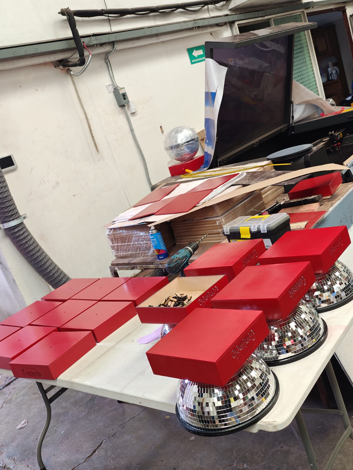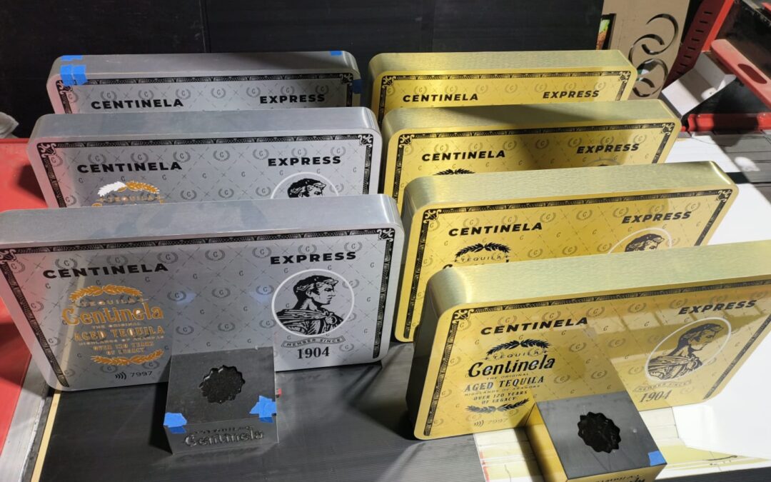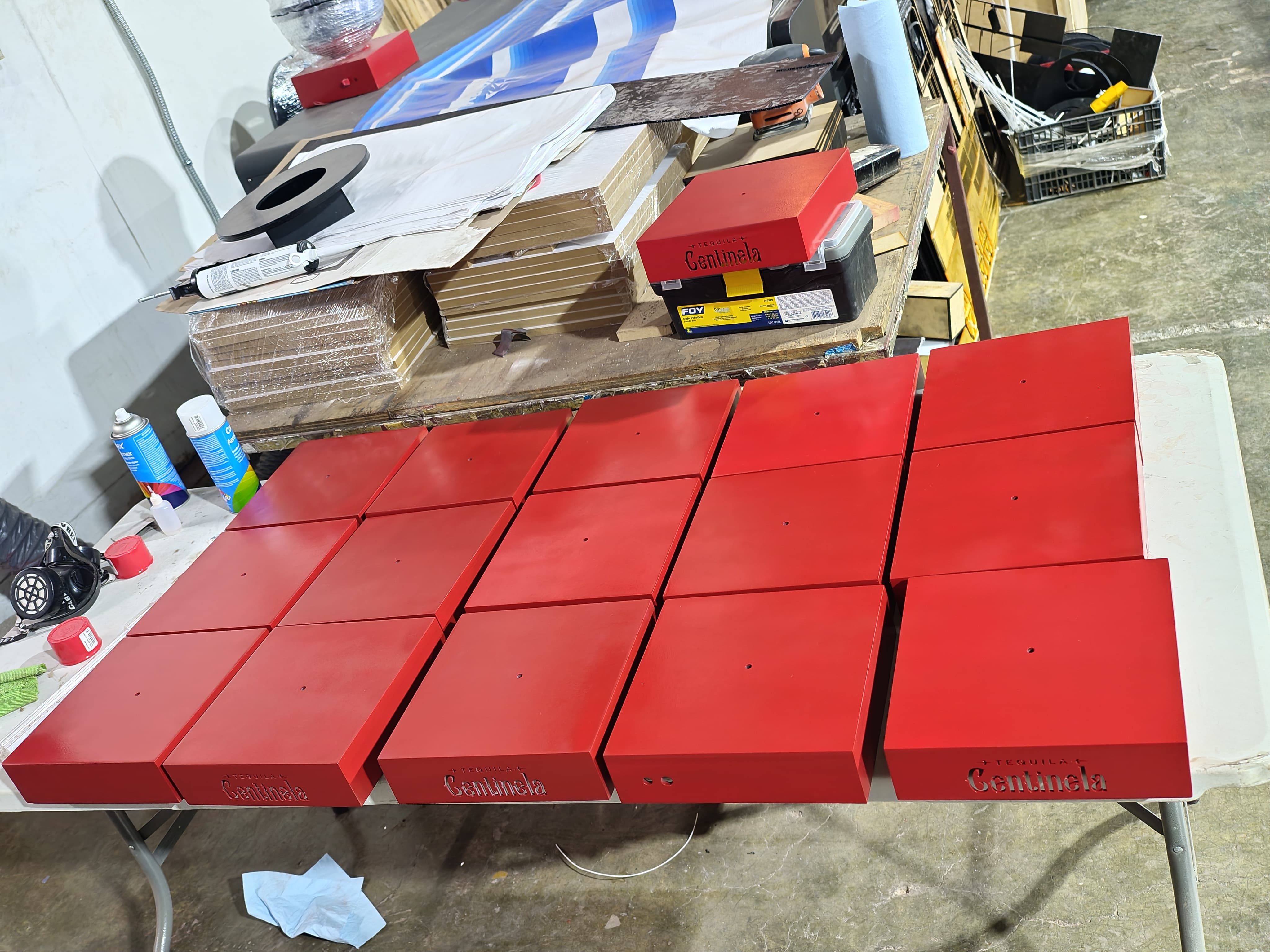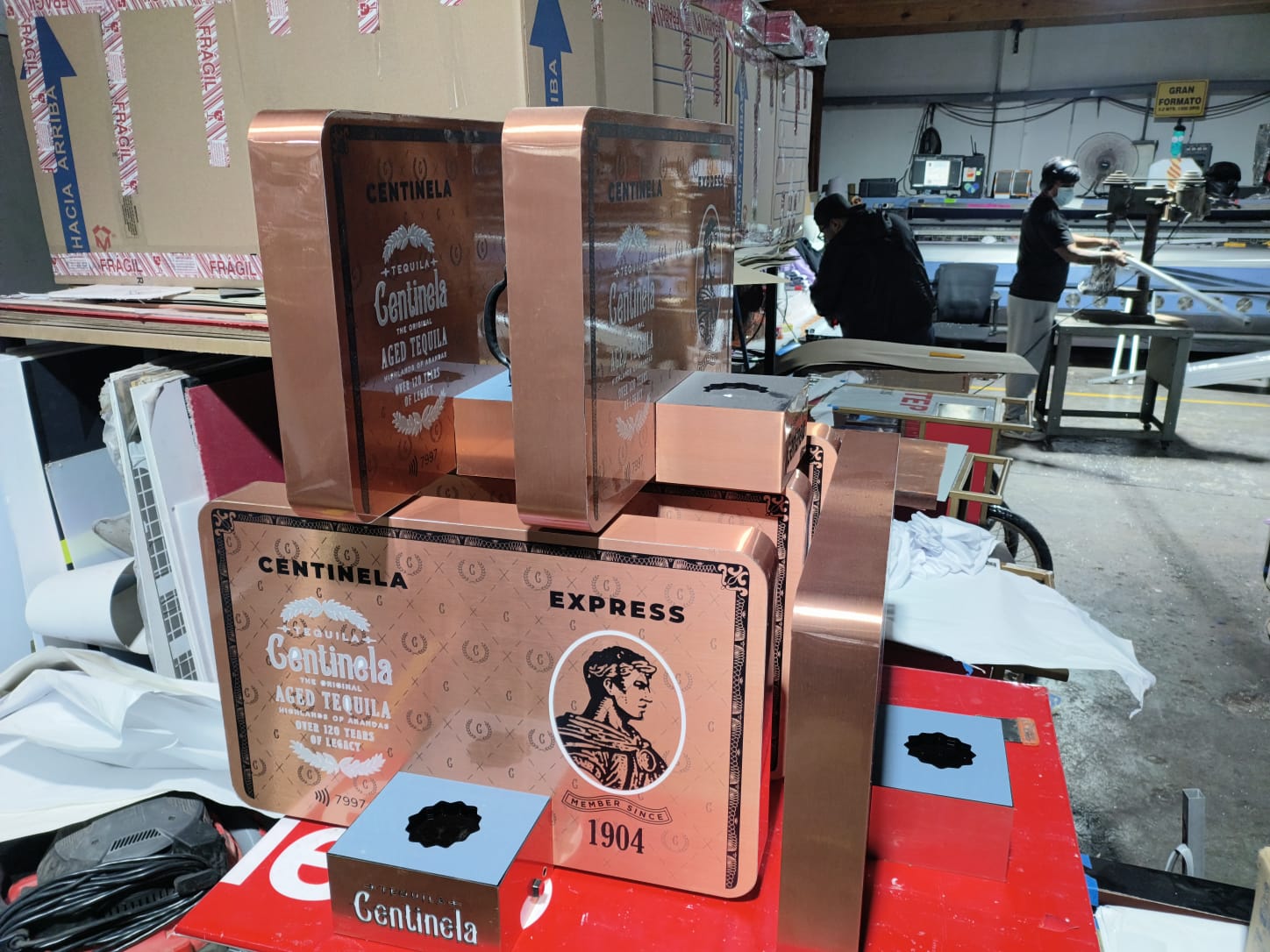 - Las bases rojas se fabricaron en MDF de alta densidad, cortado y grabado con láser CNC para lograr el relieve del texto "Tequila Centinela". Posteriormente se aplicó pintura de acabado automotriz para obtener el tono rojo característico de la marca con un terminado brillante y resistente.