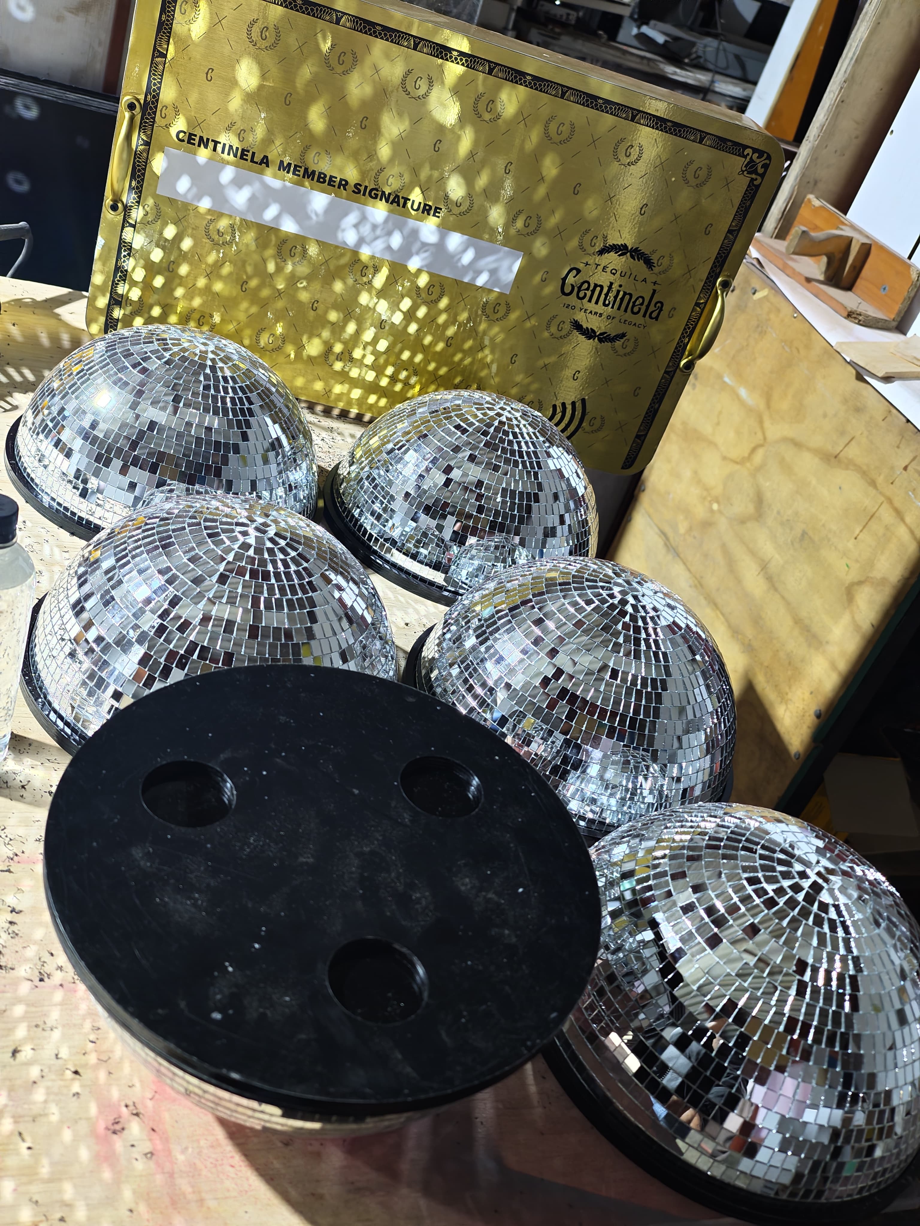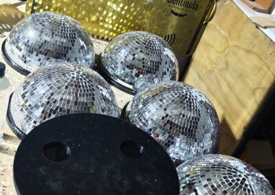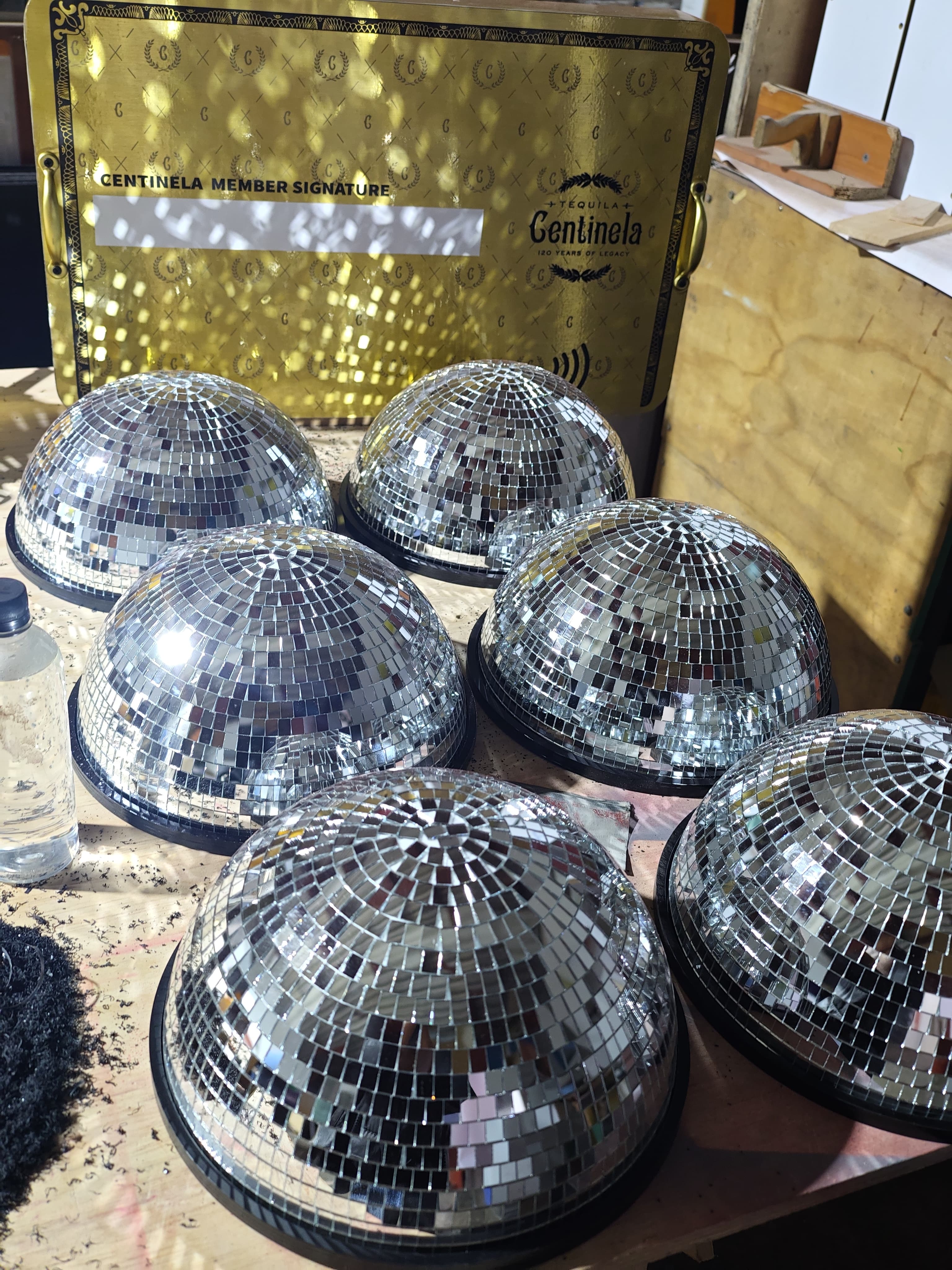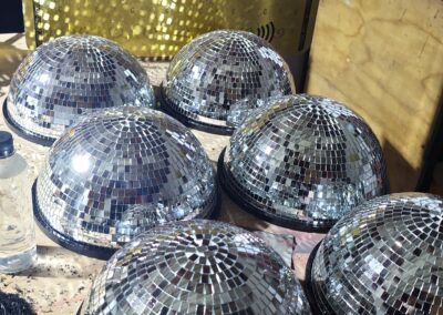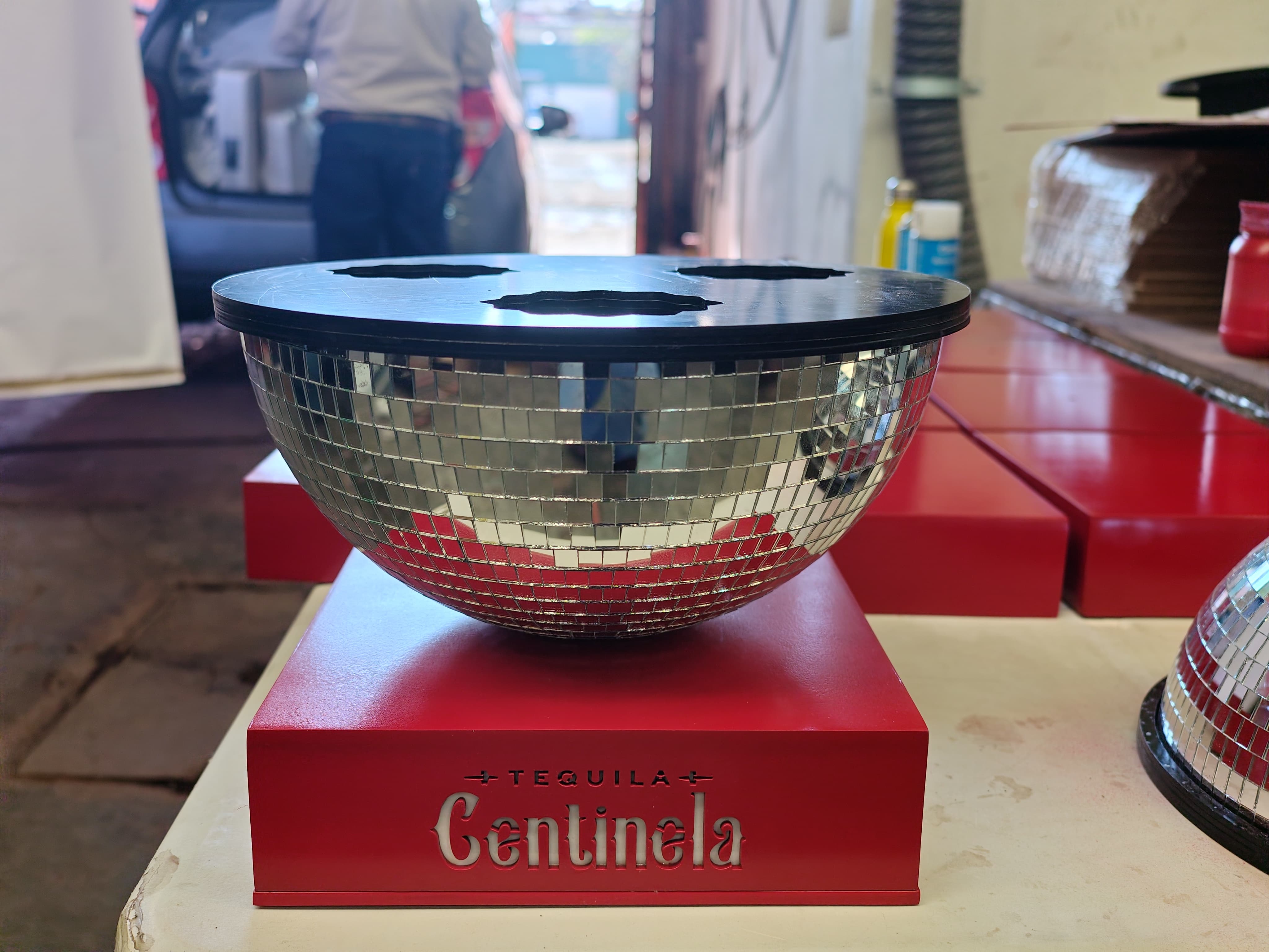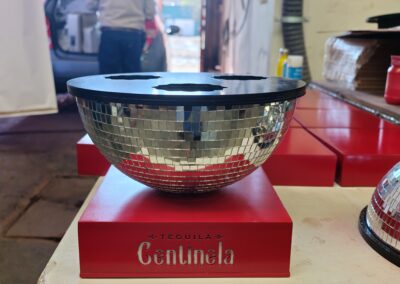 - La tercera línea, la más llamativa, integra medias esferas de espejo tipo disco sobre bases rojas brandeadas, con tapas personalizadas que incluyen calados decorativos para insertar las botellas. Esta línea captura la luz del ambiente y genera un efecto visual que atrae la mirada inmediatamente.